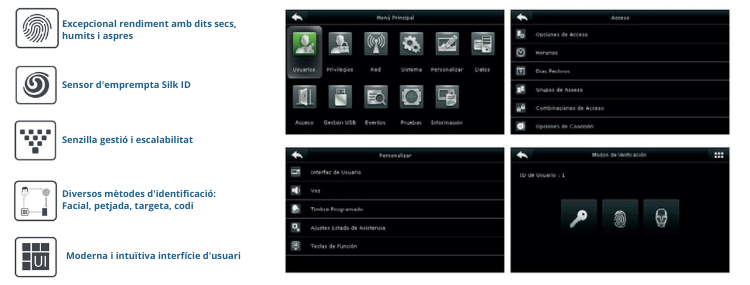 - Diferents maneres d'operació: Només emprempta, codi+emprempta, només targeta, codi+targeta.